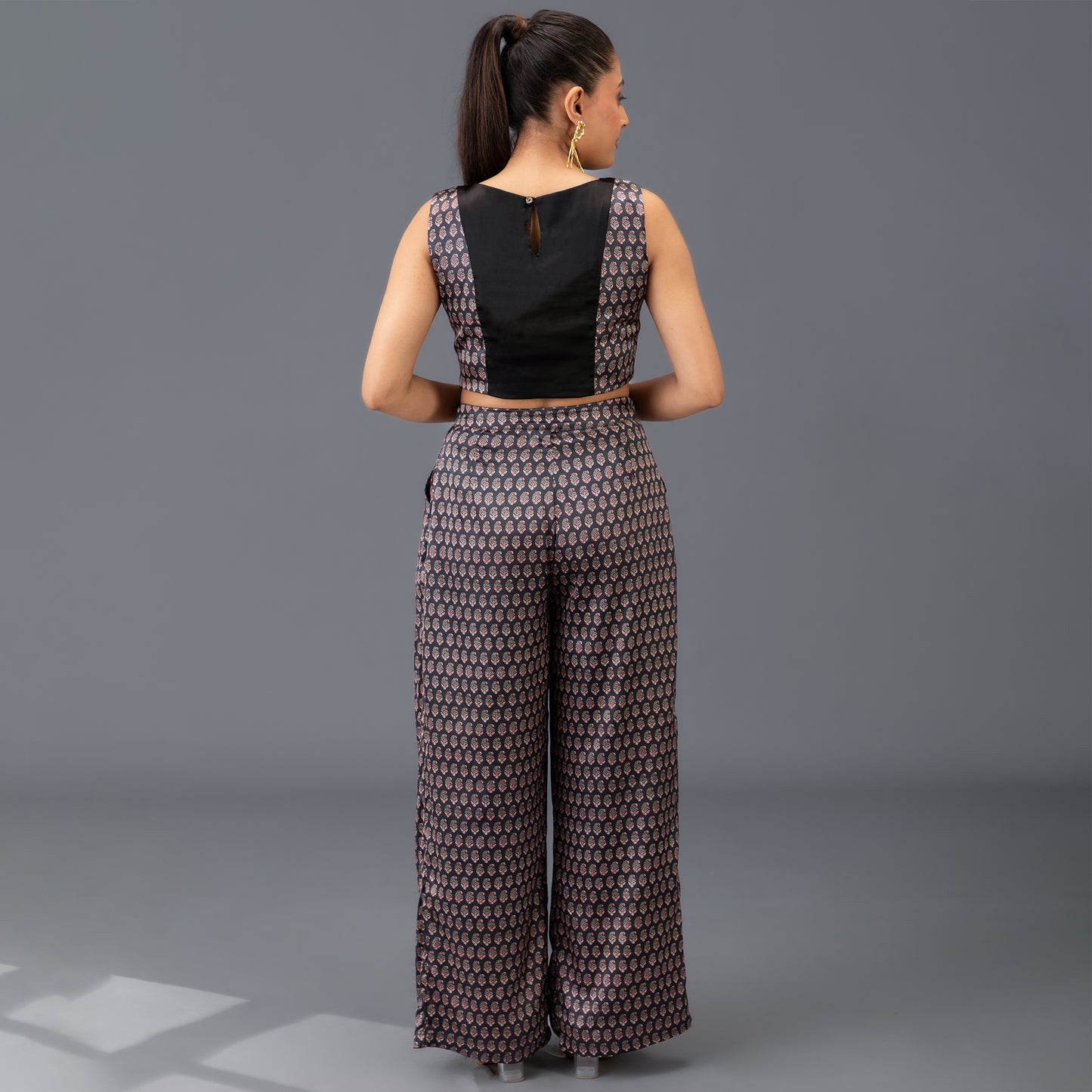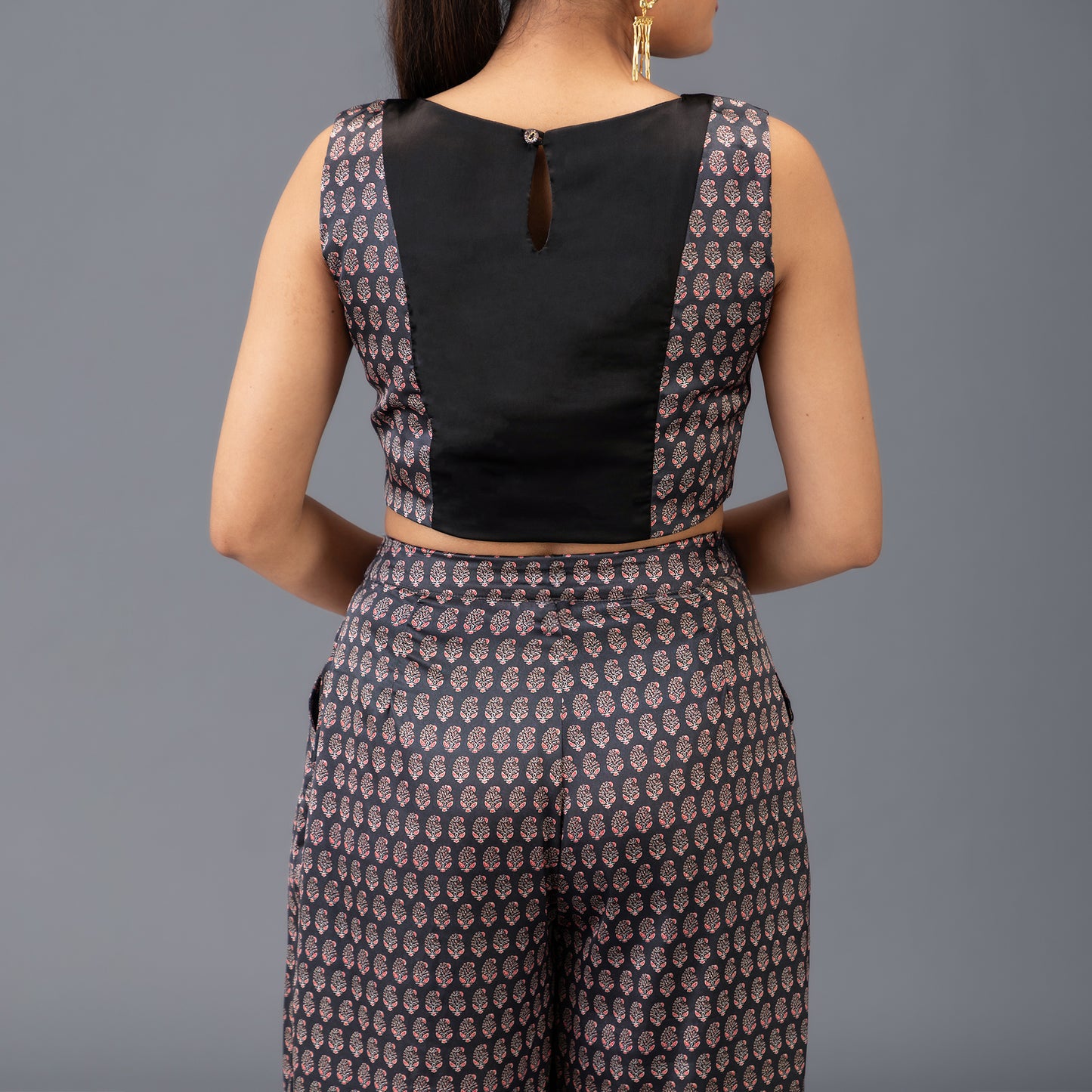 Designed with a festive flair, this co-ord set pairs a breezy pleated palazzo with a paneled crop top highlighted by contrast brocade details at the front and back. The heritage motifs of Kalamkari paisleys inspire the prints, while the functional pockets and flattering cut make it as practical as it is stylish. Lightweight, soft to touch, and flowy, it’s perfect for wedding functions, festive parties, or cocktail evenings where comfort meets elegance.