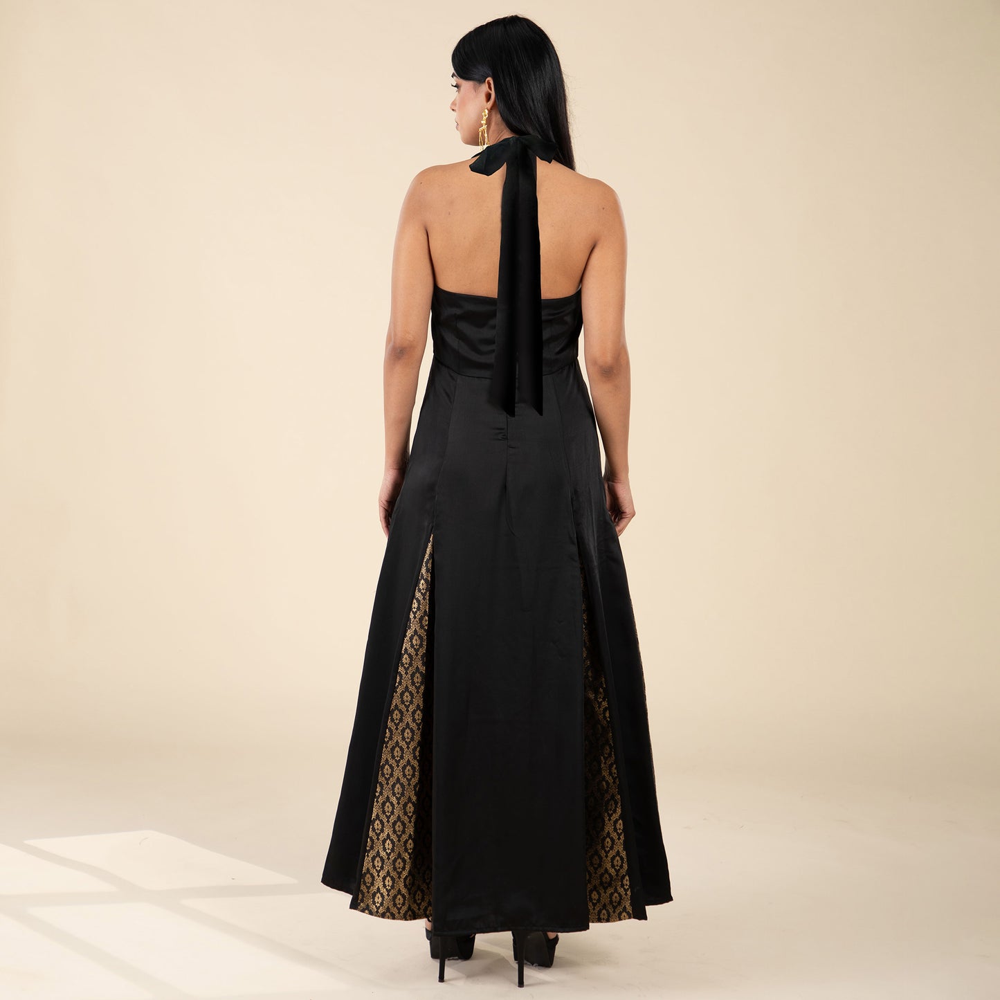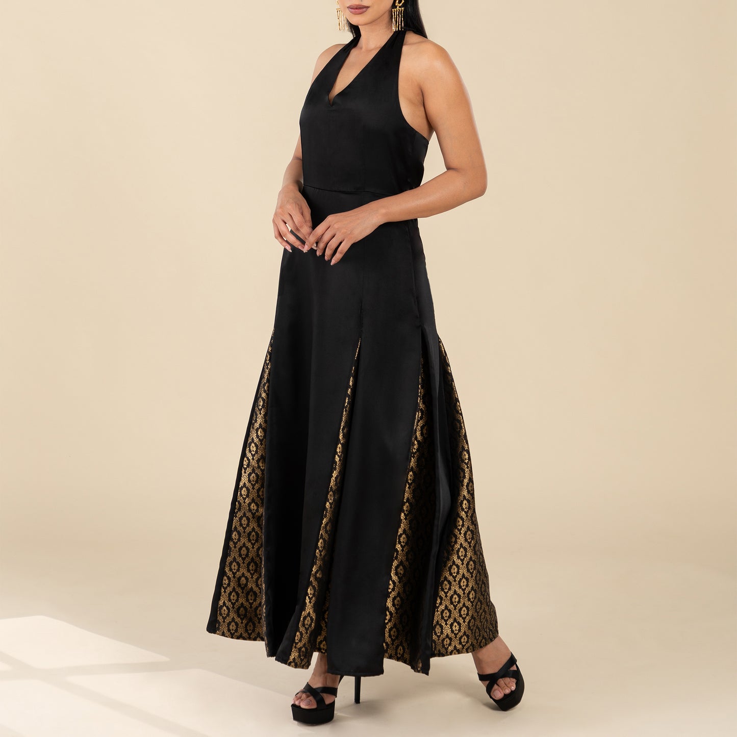 Make a dramatic entrance in this satin halter maxi dress with eye-catching brocade panelling. The luxurious black satin drapes beautifully, while the brocade inserts catch the light for a look that effortlessly combines glamour and modern artistry. Perfect for gala nights or unforgettable celebrations, this dress is designed to make you feel elegant and empowered.