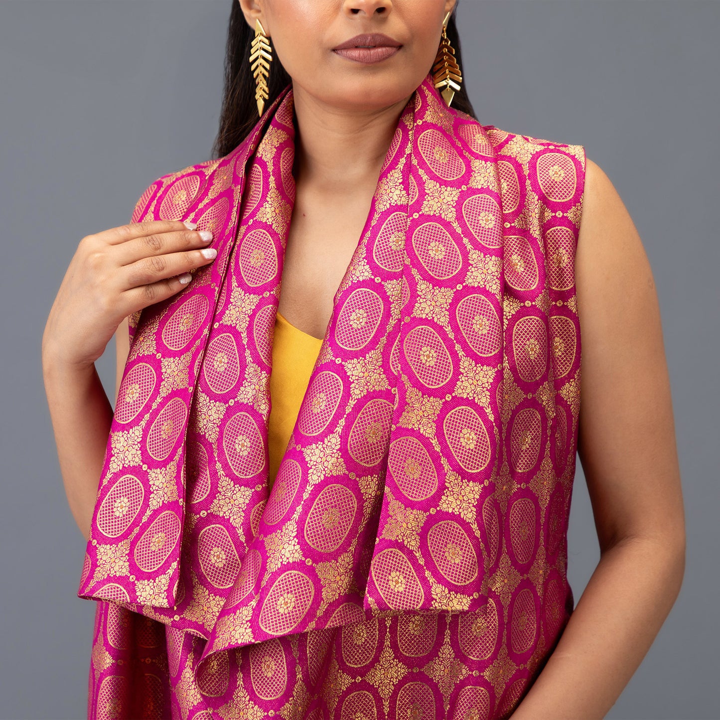 An ode to fluid form and fine detail, this sleeveless wrap jacket is cut from textured brocade in pink, patterned with intricate oval motifs. The dress-length silhouette is elevated by a cascading open cowl neckline that drapes effortlessly over the chest, blending structure with movement. Designed to adapt — cinch it at the waist for definition or wear it loose for a laid-back, luxe statement.