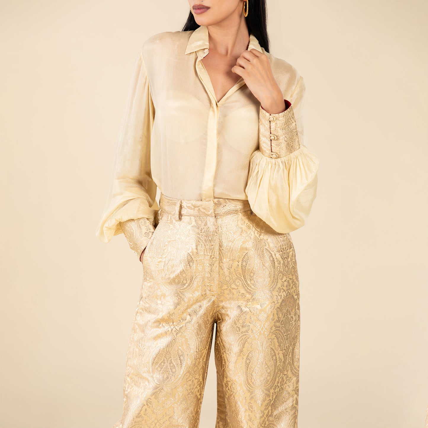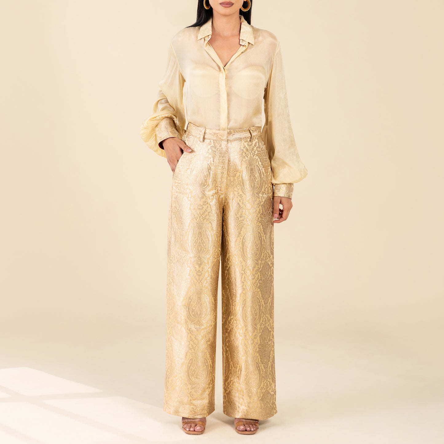 Timeless with a twist, these gold brocade trousers are tailored to capture modern fluidity while honoring the richness of Indian fabrics. Crafted in a satin brocade finish, they feature a sleek straight fit with functional side and back pockets, balancing elegance with everyday practicality. Designed for versatility, these women’s occasion wear pants move seamlessly from festive evenings to semi-formal gatherings. Pair them with a chiffon blouse for party-ready charm or style them with a flowy shirt for refined evening wear. It's a perfect modern look for special occasions like Onam.