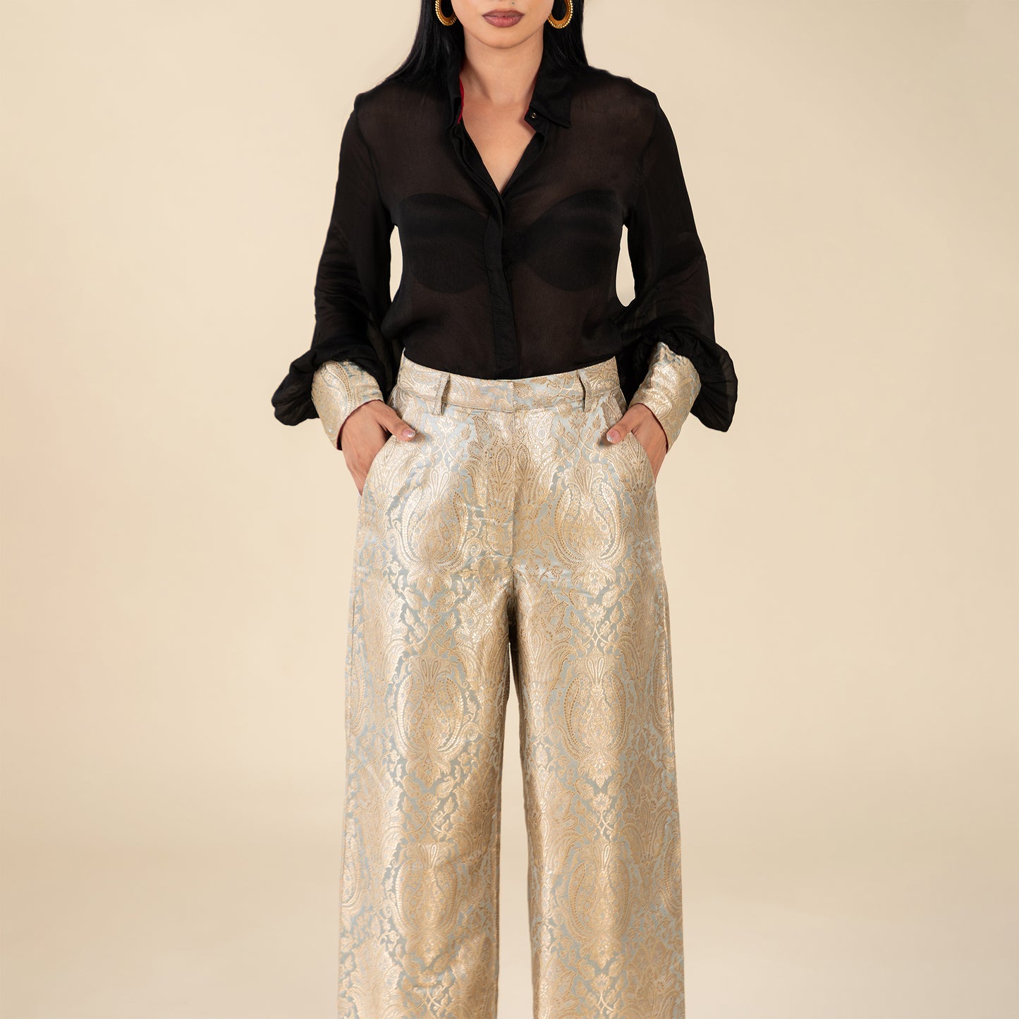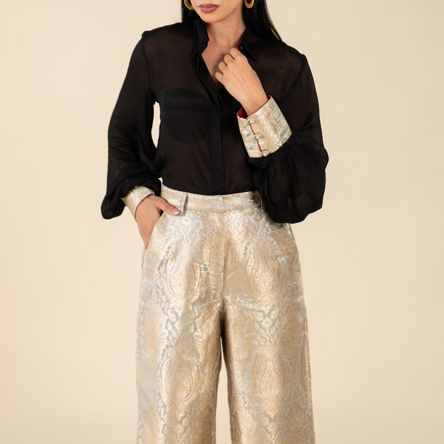 Lightweight, elegant, and sustainably made using surplus fabric, this black chiffon button-down shirt is finished with gold brocade cuffs along the sleeves for a touch of understated luxury. Cut in a relaxed fit, it pairs effortlessly with brocade tailored trousers for a classic evening outfit or with jeans for a more contemporary party look.